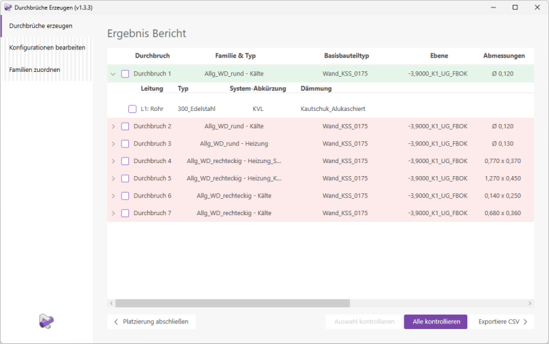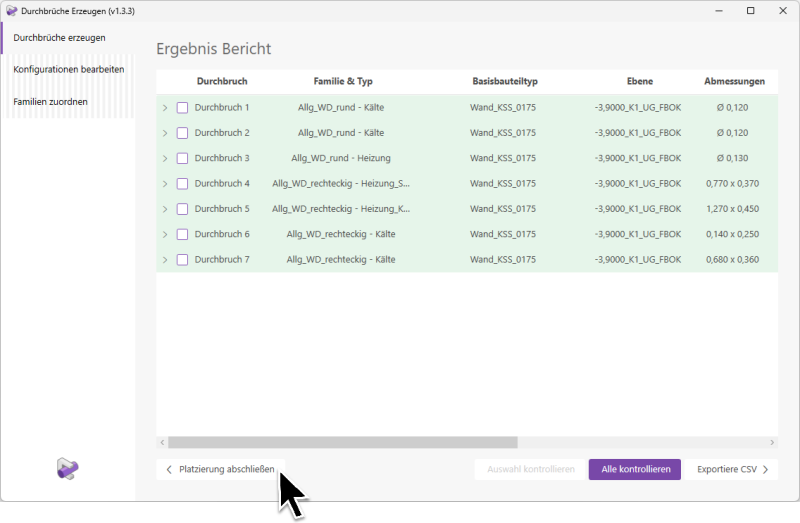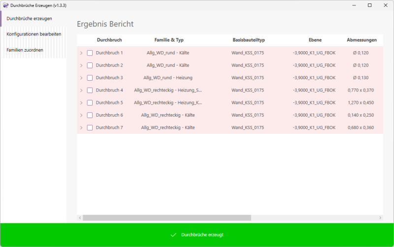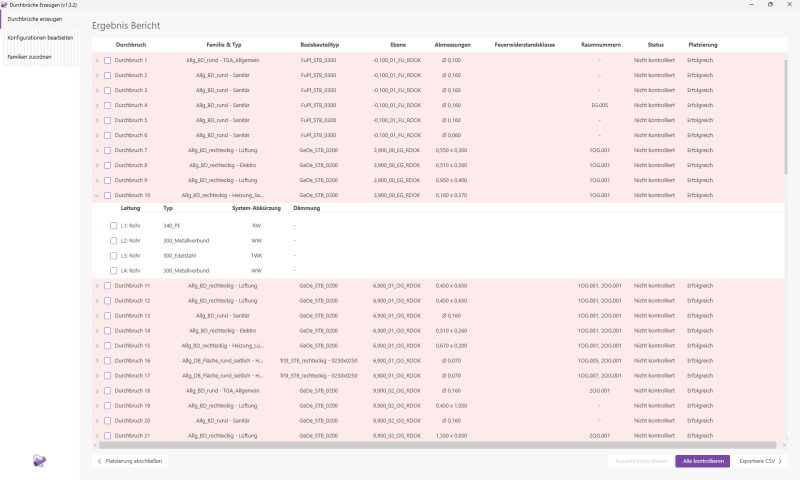 Nach dem Erzeugen der Durchbrüche wird ein detaillierter Ergebnisbericht erzeugt.