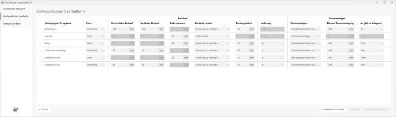 Wählen Sie die Konfiguration welche Sie unter "Konfiguration bearbeiten" erstellt haben oder nutzen Sie eine der Standardkonfigurationen. Die Konfiguration bestimmt Form und Abmessungen der Durchbrüche je nach Typ/System.