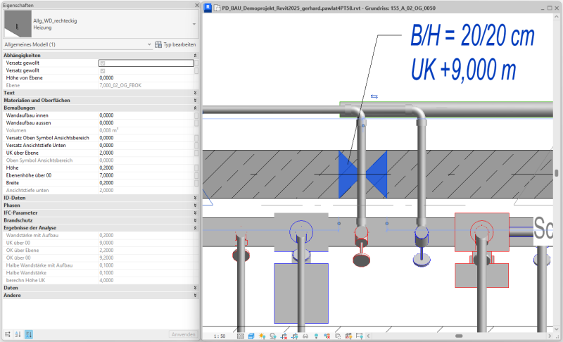 Diverse Informationen wie Ebene, Raumnummern und Abmessungen der Durchbrüche werden dargestellt. Bei den Familien und Typen fällt auf, dass sowohl runde als auch rechteckige Durchbrüche platziert wurden. Das liegt einerseits daran, dass unterschiedlichen Leitungskategorien unterschiedliche Durchbruchformen zugewiesen sind. Andererseits wurden einige runde Durchbrüche zu einem rechteckigen Durchbruch zusammengelegt. Die entsprechenden Einstellungen sind in der Konfiguration definiert, welche wir für die Platzierung benutzt haben.