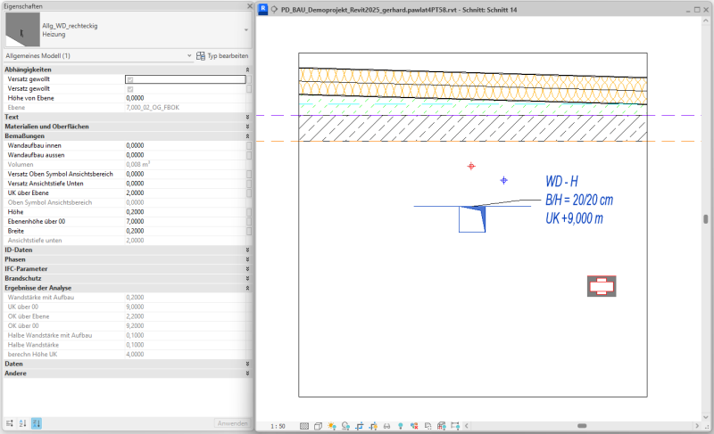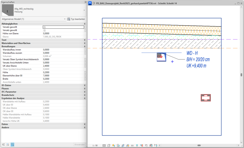 Wir springen nun zum Wanddurchbruch 61. Da wir aktuell im 2D-Modus sind wird eine Schnittansicht erzeugt.
