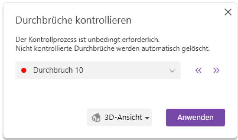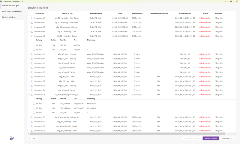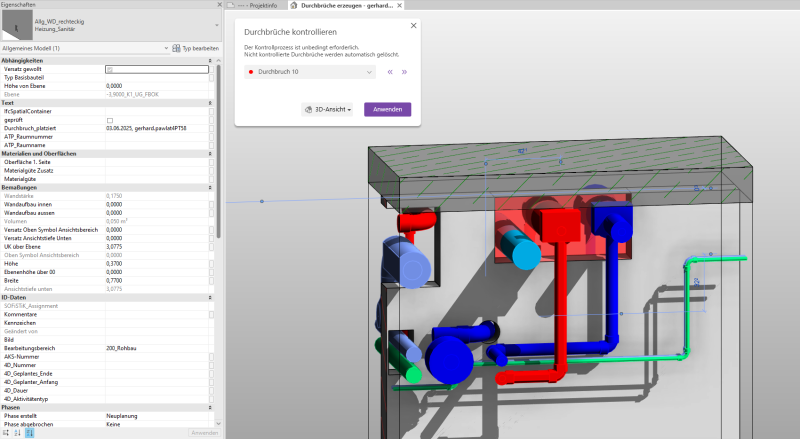 Die Durchbrüche müssen nun kontrolliert werden, wählen Sie die Schaltfläche "Alle kontrollieren" um mit dem Vorgang zu beginnen. Es öffnet sich ein Navigationsfenster und eine Kontrollansicht. Der aktive Durchbruch ist in Revit ausgewählt (im Eigenschaftenfenster sind somit die Eigenschaften des Durchbruchs sofort sichtbar) und ist farblich markiert. Die Farbfüllung entspricht dabei dem Kontrollstatus des Durchbruchs.