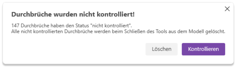 Sie können nun wählen ob die nicht kontrollierten Durchbrüche gelöscht werden sollen, oder ob Sie den Kontrollvorgang fortsetzen möchten.