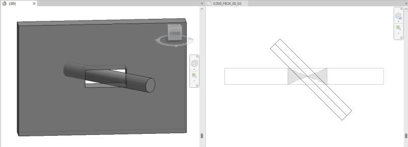 Beim Platzieren runder Durchbrüche gibt es gewisse Besonderheiten zu beachten. Ist das kollidierende Leitungselement nicht orthogonal zum Basisbauteil, so wird automatisch ein rechteckiger Durchbruch erstellt. Runde Durchbrüche werden somit ausschließlich bei Kreuzungswinkel 90° erstellt.