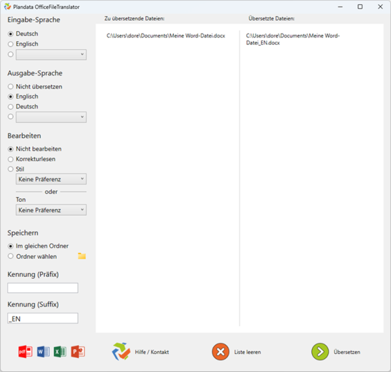Nach dem Hinzufügen der Dateien stehen Ihnen in der linken Seitenleiste weitere Optionen zur Verfügung. Hier können Sie unter anderem einen Speicherpfad für die zu übersetzenden Dateien festlegen sowie eine Kennung (Präfix oder Suffix) definieren, die an den Dateinamen angehängt wird.