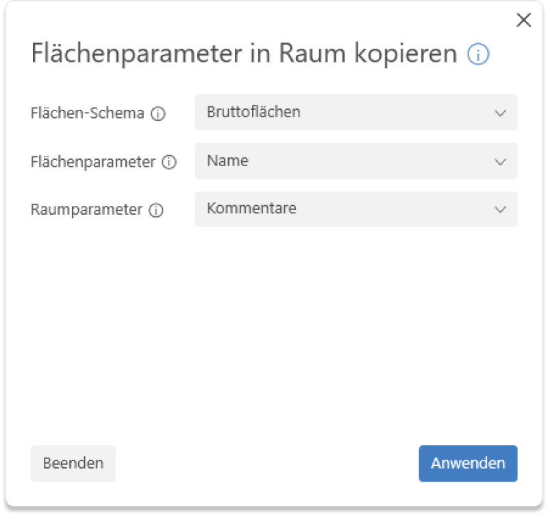 Parameter dessen Wert in den Raum kopiert werden soll. Es stehen nur jene Parameter zur Auswahl, die in wenigstens einer Fläche einen Parameterwert besitzen.