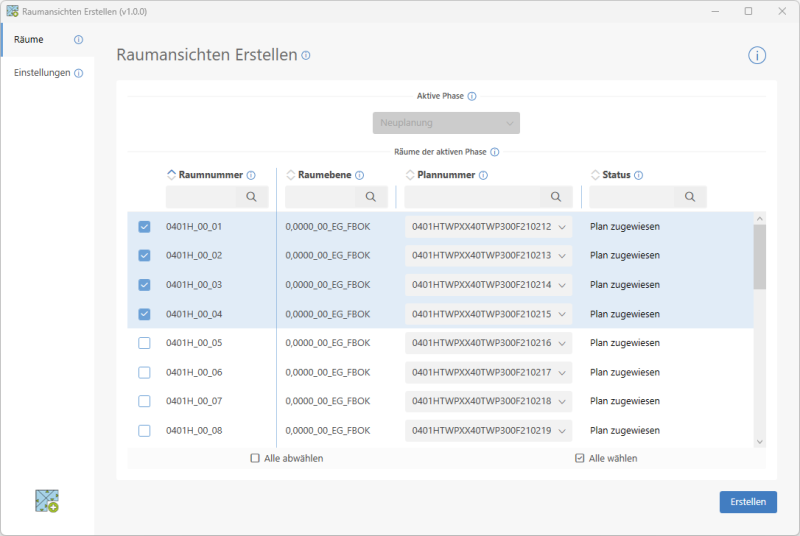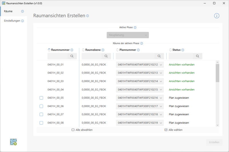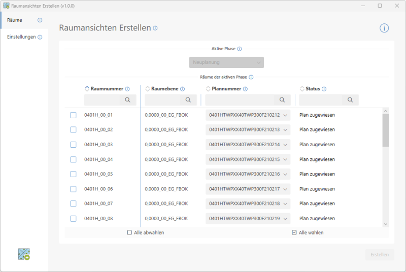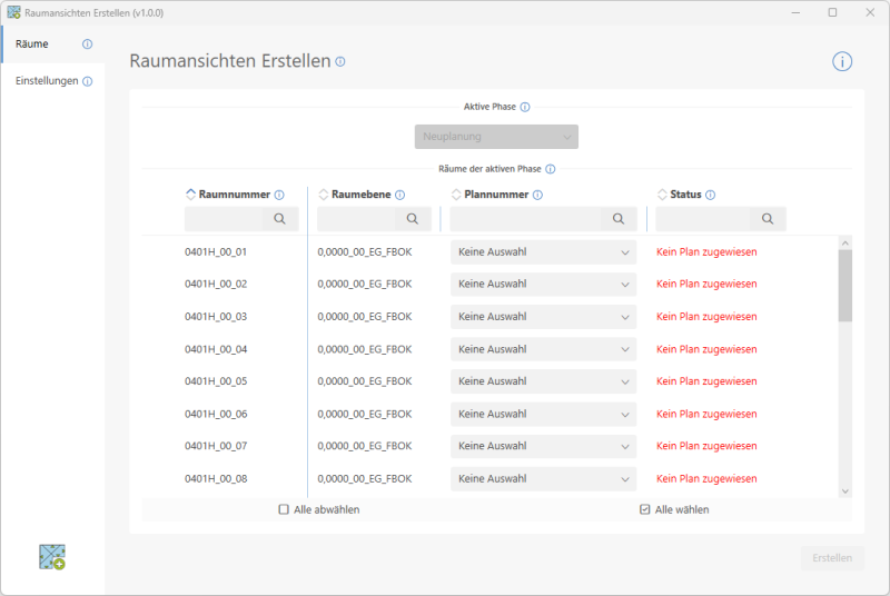 Auf der Seite Räume erhalten Sie eine Übersicht über alle Räume im aktiven Modell, welche der gewählten Phase entsprechen. Sind Räume nur in einer Phase vorhanden, so ist diese bereits automatisch ausgewählt.