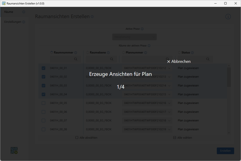 Die Ansichten wurden erfolgreich erzeugt und auf den entsprechenden Plänen platziert. Der Status der Räume wurde aktualisiert und lautet nun "Ansichten Vorhanden".