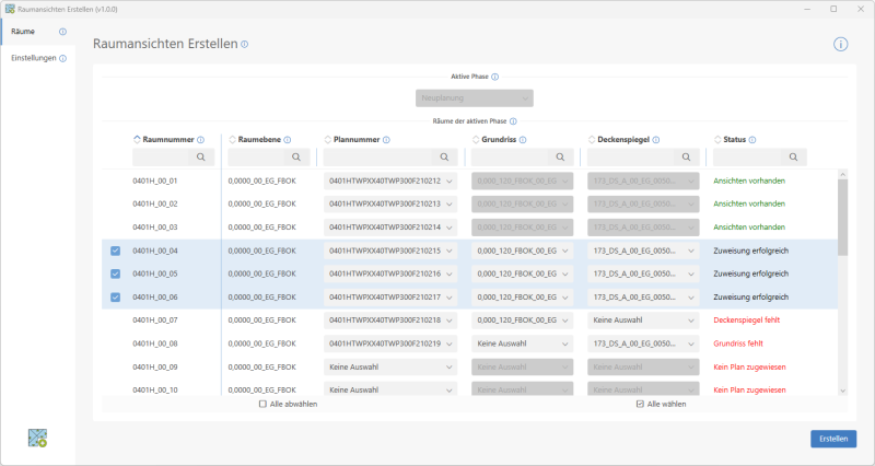 Sind diese Eigenschaften erfüllt, wird der Status "Zuweisung erfolgreich" angezeigt, der Raum kann nun ausgewählt werden und Ansichten können erstellt werden.